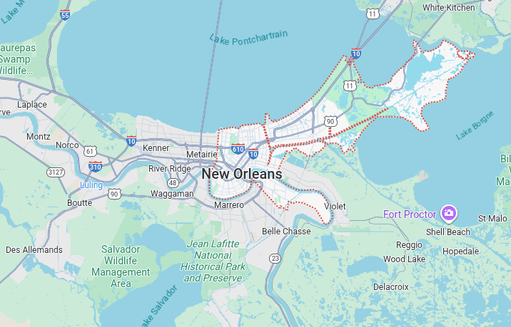 The closest airport is Louis Armstrong New Orleans International Airport where you can rent a car to complete your journey.